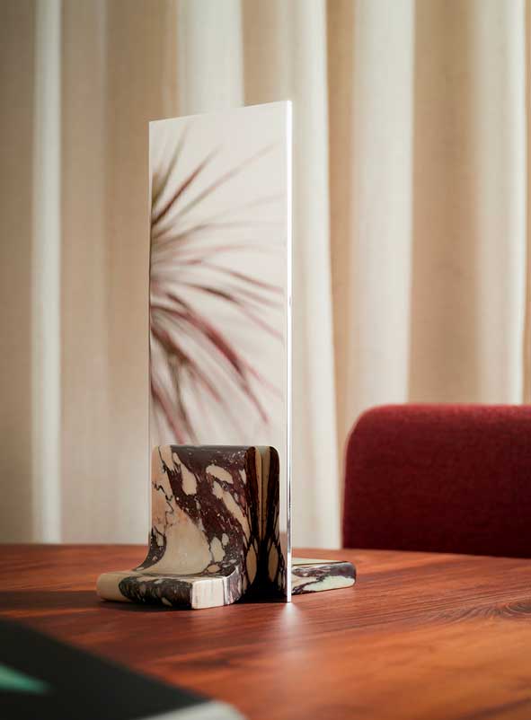 Inspired by the swallow birds common in Denmark, the Svale Mirror features an abstracted swallow silhouette made from blackened walnut. An arch shape, thematic in Bower's work, is completed with a grey tinted mirror, filling in the negative space beneath each of the swallow's wings.