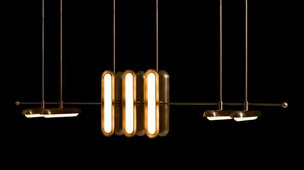 Description A glowing glass capsule nests in a brass shade, becoming a contained form that multiplies to construct larger fixtures. Designed by Apparatus