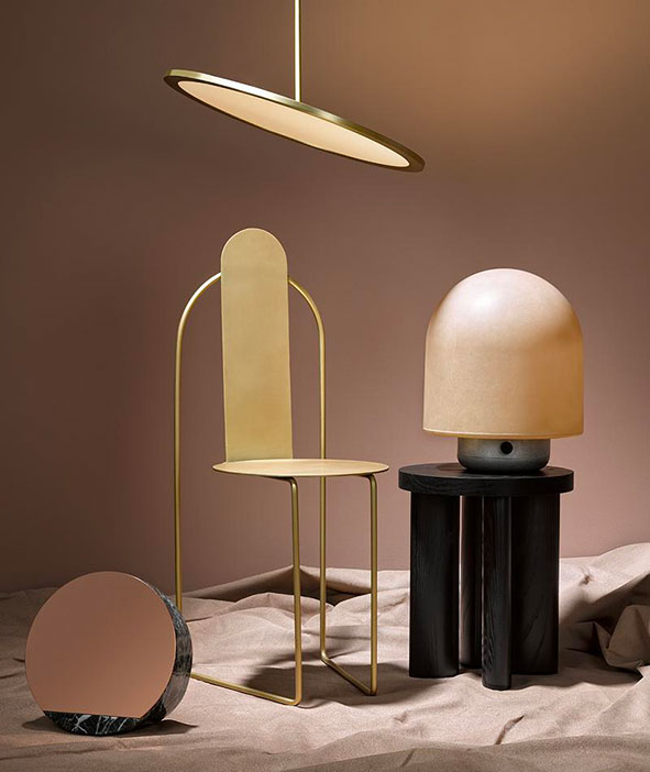 Puffball, a collection of minimal lamps, draws inspiration from the rounded caps and columned stalks of wild mushrooms and toadstools. The chunky silhouettes, made of raw fiberglass and tumbled or painted aluminum, give off a warm luminescent glow.