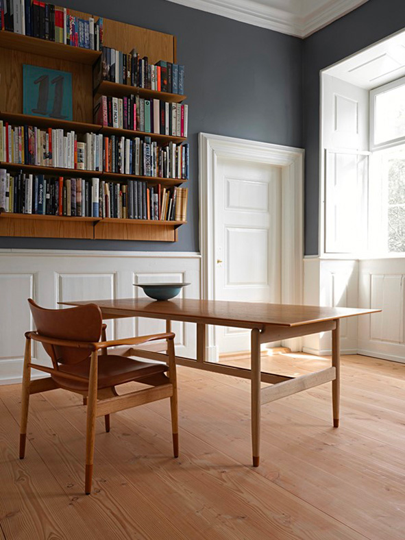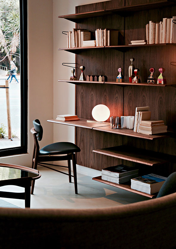 L’ensemble s’ouvre sur une référence majeure : The Kaufmann Table de Finn Juhl. Cette pièce presque entièrement façonnée à la main incarne la quintessence de l’artisanat, de l’élégance et de la sobriété scandinaves. En écho à cette approche architecturée, l’élégant Panel System de Finn Juhl complète l’espace. Ce système modulaire mural d’étagères et de panneaux offre de multiples compositions ainsi qu’un large choix de matières.