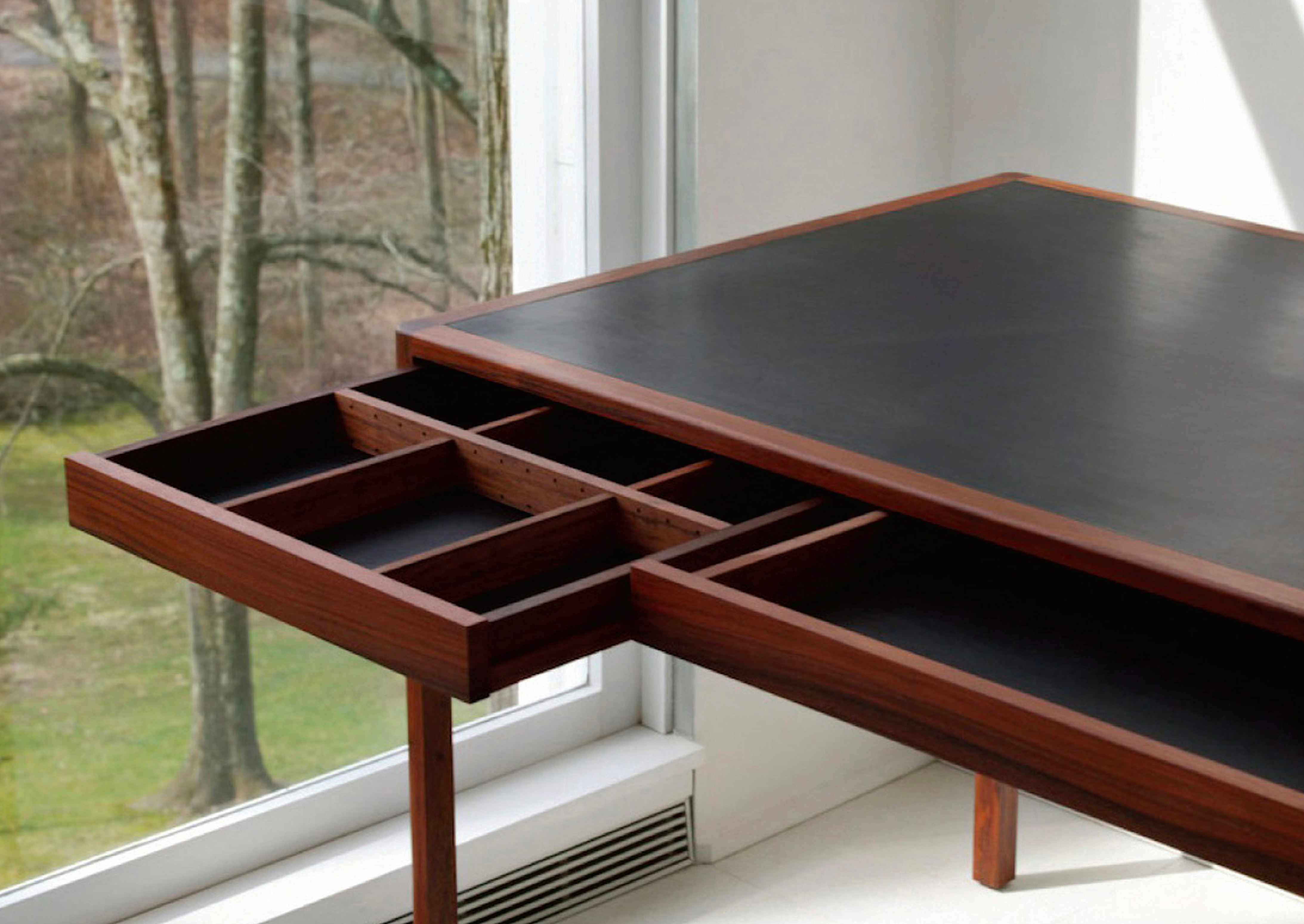 L’organisation se prolonge avec le Glove Cabinet de Finn Juhl, petit meuble de rangement en bois de cerisier japonais. Raffiné et fonctionnel, il ajoute une touche de couleur et de légèreté à cet environnement soigné.