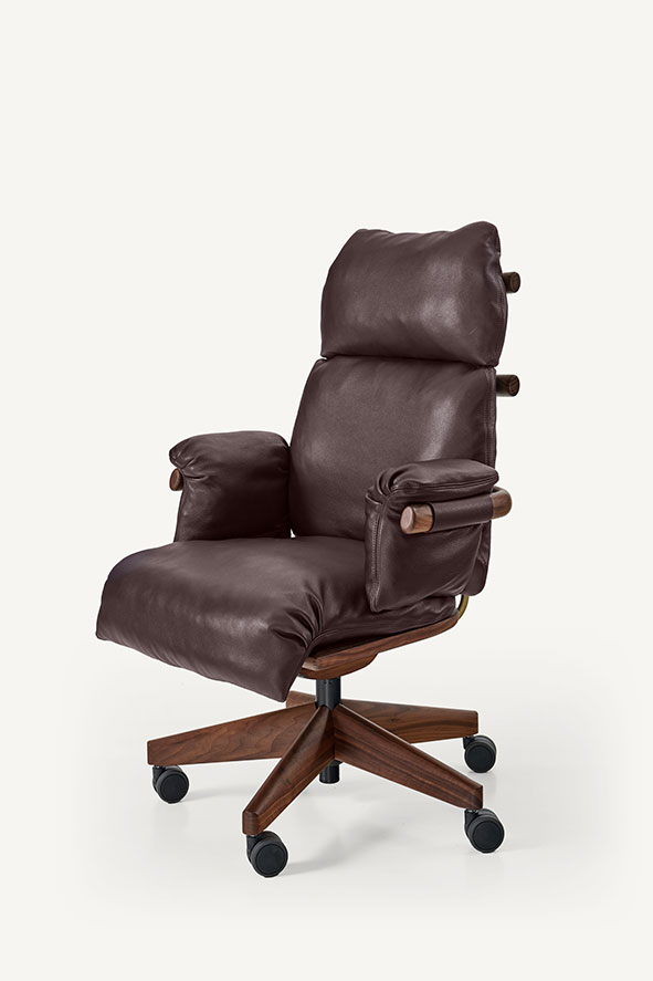Au centre de la composition peut également trôner le Leather Desk signé BassamFellows. Son design fin conjugue praticité et esthétisme : une structure en bois massif discrète, un plateau gainé de cuir pleine fleur qui se patine avec le temps, et trois tiroirs quasi invisibles. Face à ce bureau, la chaise de travail de luxe Ramus High Back, également par BassamFellows, incarne le parfait équilibre entre ergonomie et raffinement.