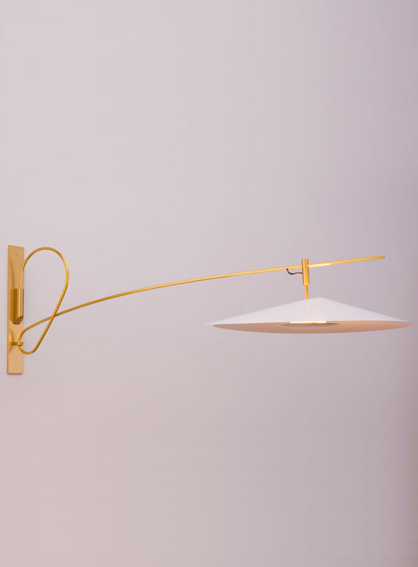 L'applique Treble est dotée d'un bras unique pivotant fixé à un support mural en laiton massif. LA lampe est équipée d'un abat-jour Treble à tension douce éclairé par une ampoule LED à intensité variable avec diffuseur en acrylique.